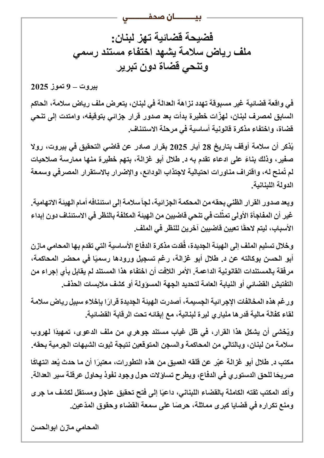 وكان سلامة قد أوقف بتاريخ 28 أيار 2025 بقرار صادر عن قاضي التحقيق في بيروت، رولا صفير، وذلك بناءً على ادعاء تقدم به د. طلال أبو غزالة، بتهم خطيرة منها ممارسة صلاحيات لم تُمنح له، واقتراف مناورات احتيالية لاجتذاب الودائع، والإضرار بالاستقرار المصرفي وسمعة الدولة اللبنانية.